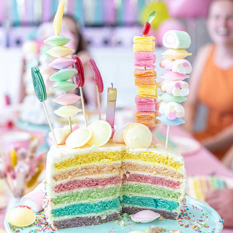 - Candy Tower Cake: Der Hingucker - ein White-Cake, rundum mit Streuseln und Spießen aus Lollis, UFO-Waffeln, Marshmallows & sauren Streifen. Tipp: Kids stecken die Spieße selbst – wer baut den buntesten Candy-Tower?