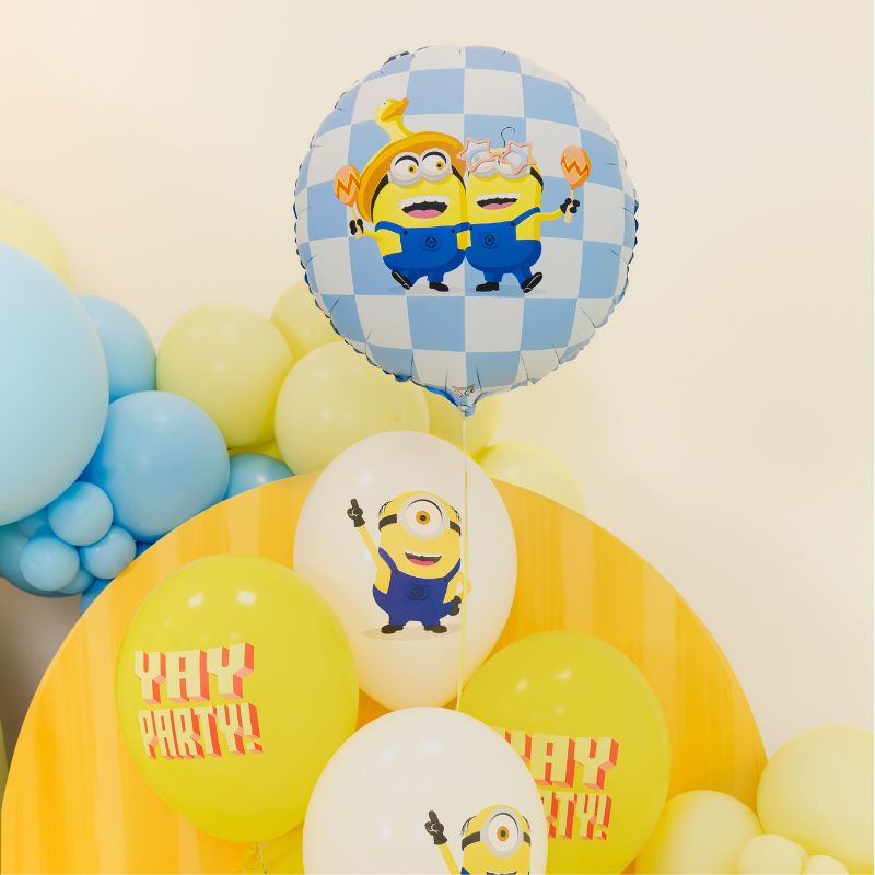 Stylischer Ballon mit Schachbrettmuster in Blau und Minion Motiv passend zum neuen Film.