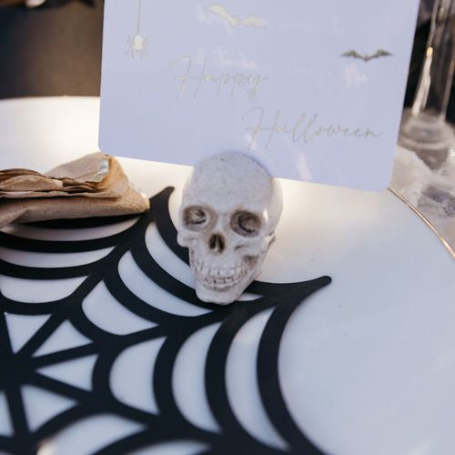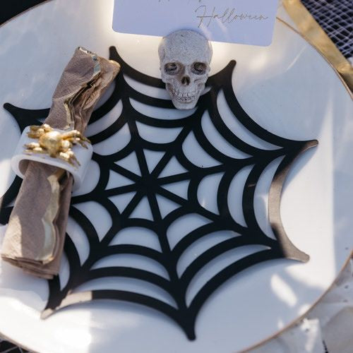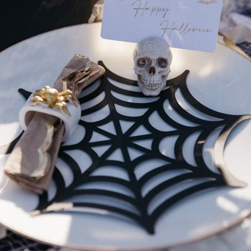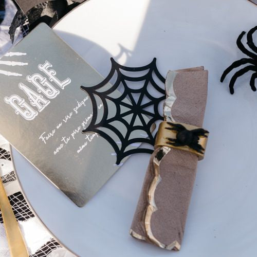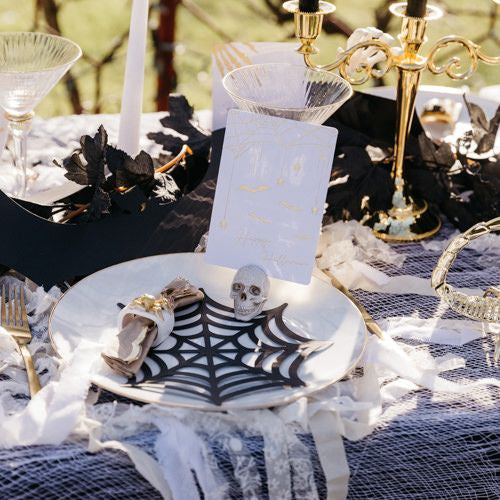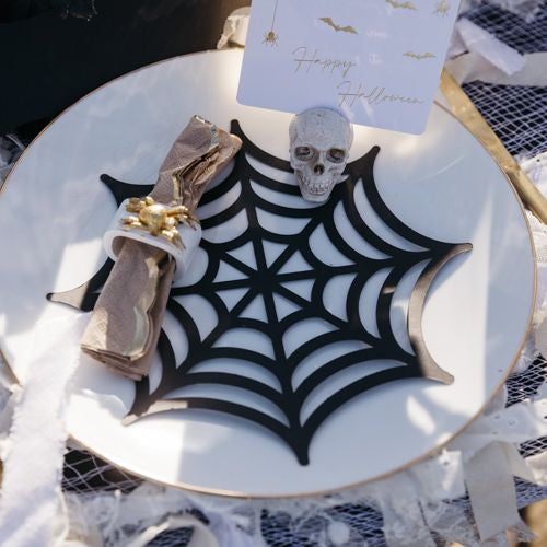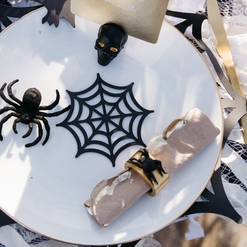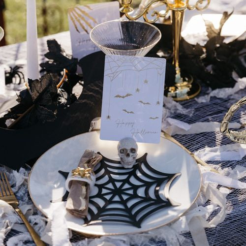 3 schwarze Spinnweben für die Halloween Tischdeko