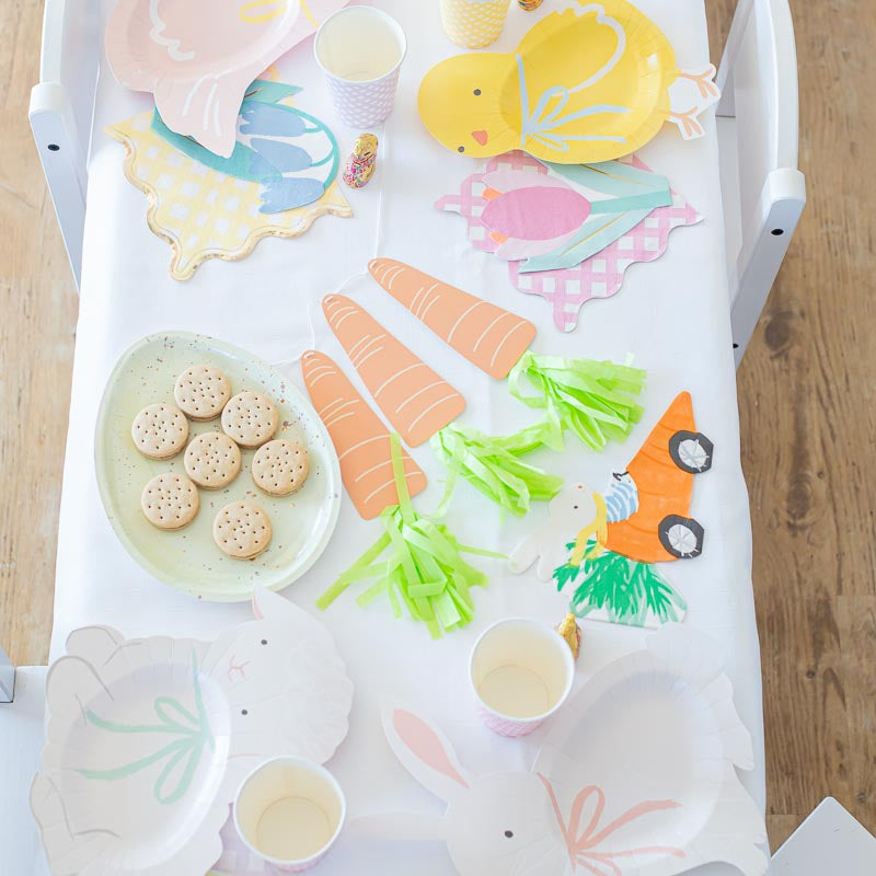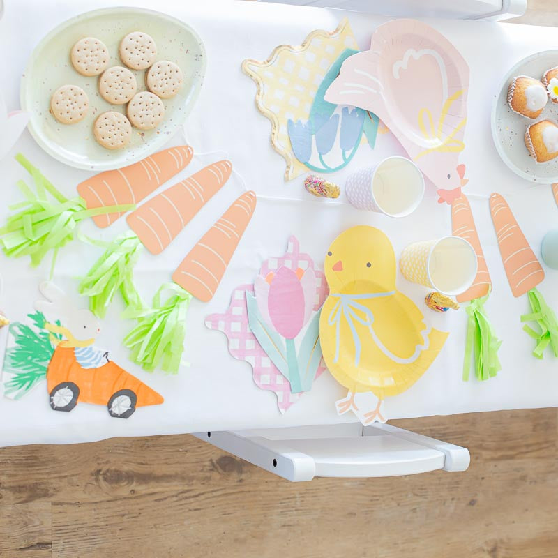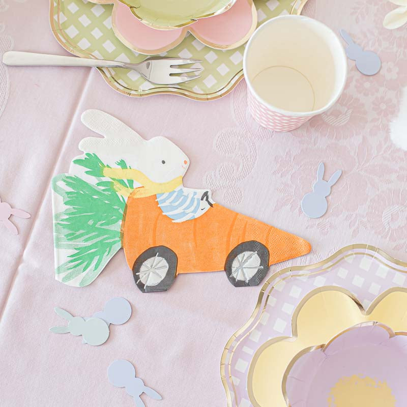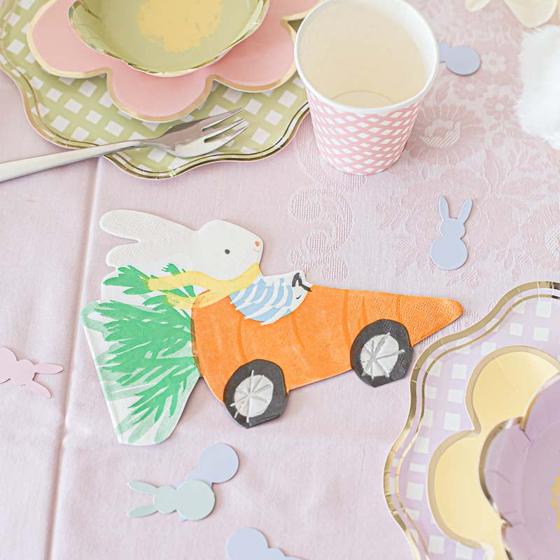Karotte als Rennauto mit Osterhase am Steuer als Servietten für die Ostertafel