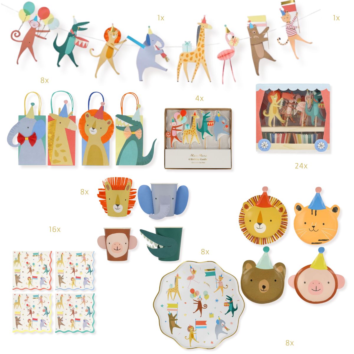 Diese Deko in bunten Farben mit den niedlichen Party Tieren aus der Designschmiede von Meri Meri ist ein Hingucker!