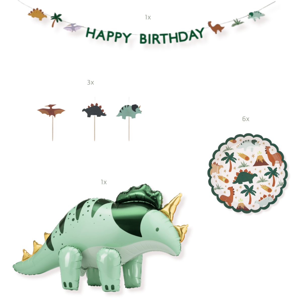 Mit Partytellern, Kerzen, einer Girlande und dem stehenden Triceratops-Ballon verwandelst du eure Partylocation im Nu in einen Partytraum.