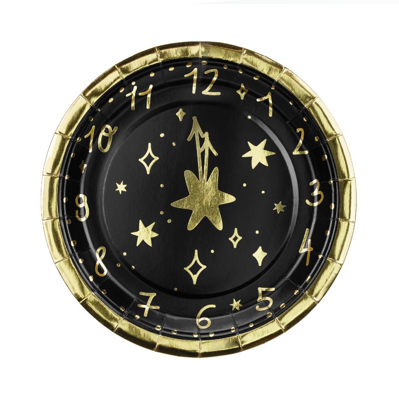 Uhr Party Teller / Schwarz / Silvester (6 Stück)