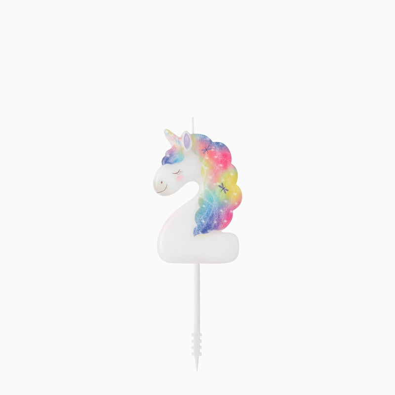 Weiße Zahl mit farbenfrohem Einhornkopf als Kerze für die Kuchendeko.