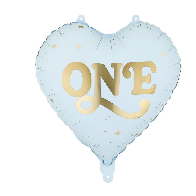 Hübscher Herz-Folienballon in Hellblau mit "ONE"-Schriftzug in Metallic-Gold.