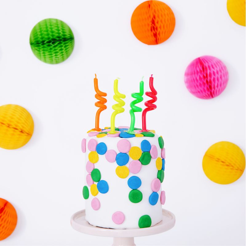 Jeweils eine Kerze in Neon Gelb, Rot, Grün und Orange. Inklusive Halterungen für den Kuchen.