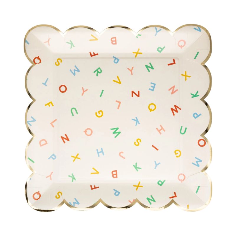 Diese großen Teller mit buntenmBuchstaben-Salat und Gold-Metallic Wellenrand sind ein stylischer Hingucker für eure Deko zur Einschulung.