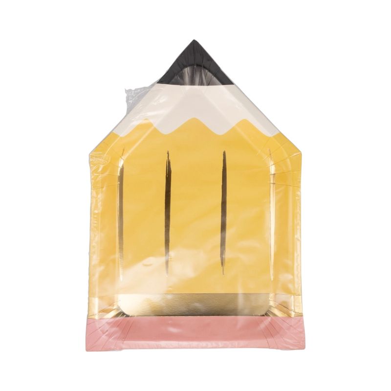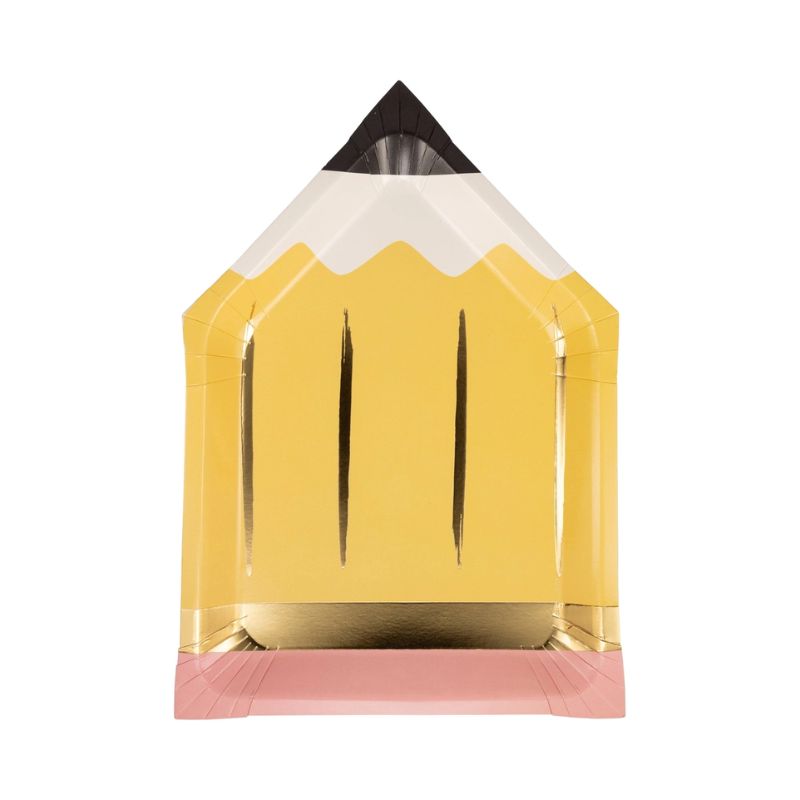Diese gelben Party Teller in Bleistift Design sind sind toller Hingucker für eure Deko zur Einschulung.