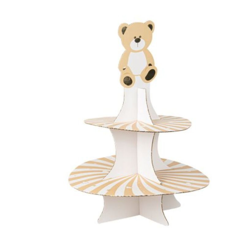 Weiße Karton Etagere mit Teddy Motiv und Streifen-Swirl-Muster in Beige.